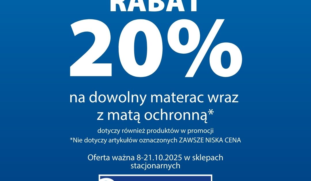 Dodatkowy rabat 20% na dowolny materac wraz z matą ochronną w JYSK! Oferta dotyczy również produktów w promocji i jest ważna w dniach 8-21.10.2025 (tylko w sklepach stacjonarnych). *Nie dotyczy artykułów oznaczonych ZAWSZE NISKA CENA.