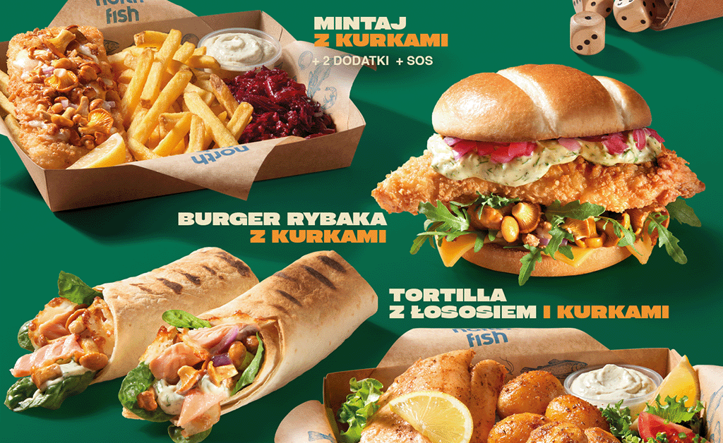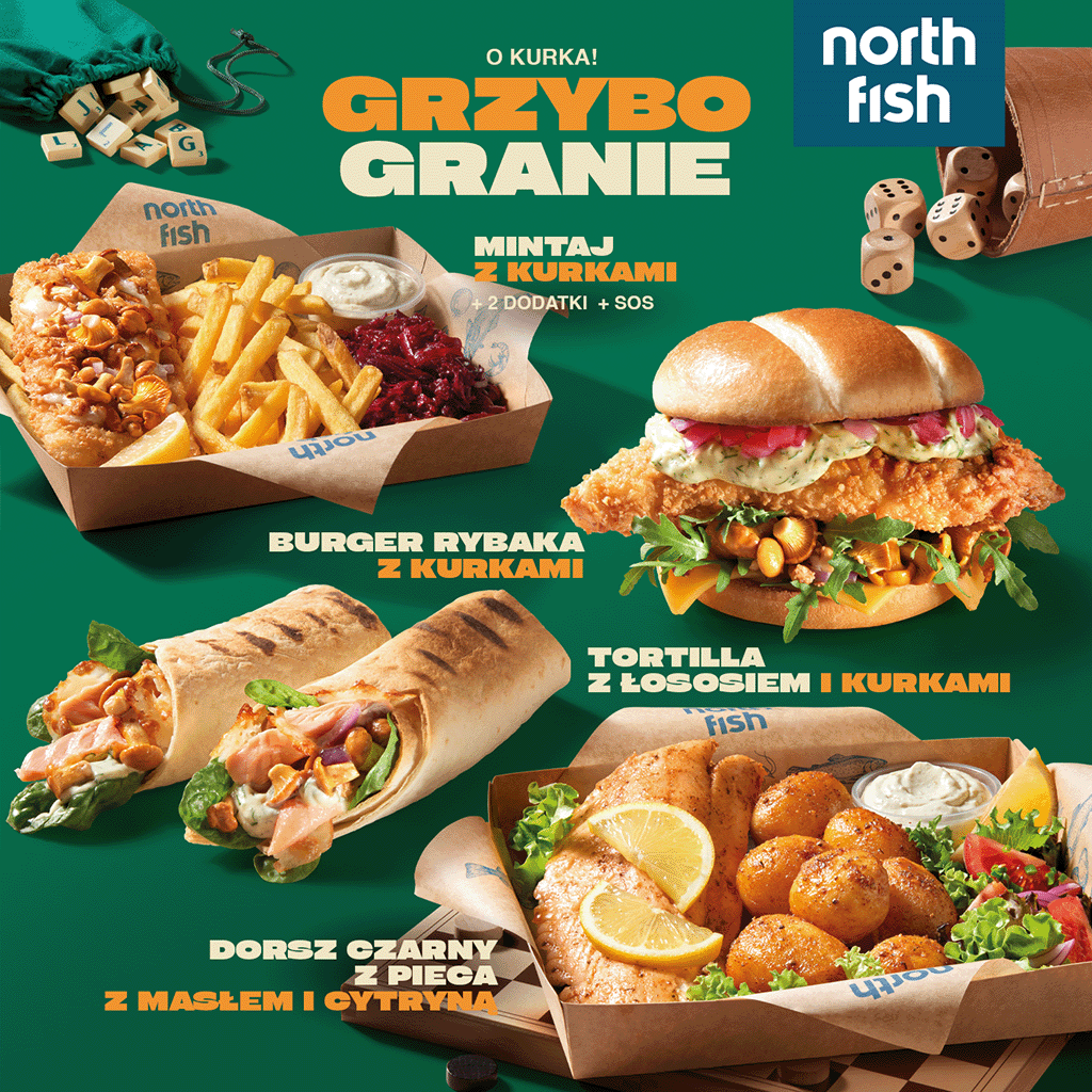 North Fish startuje z nową kampanią „Grzybo Granie”. W menu pojawiły się cztery sezonowe nowości z aromatycznymi kurkami: Burger Rybaka z nutą wasabi, Mintaj z prażoną cebulką, Dorsz czarny z pieca z masłem i cytryną oraz Tortilla z łososiem.