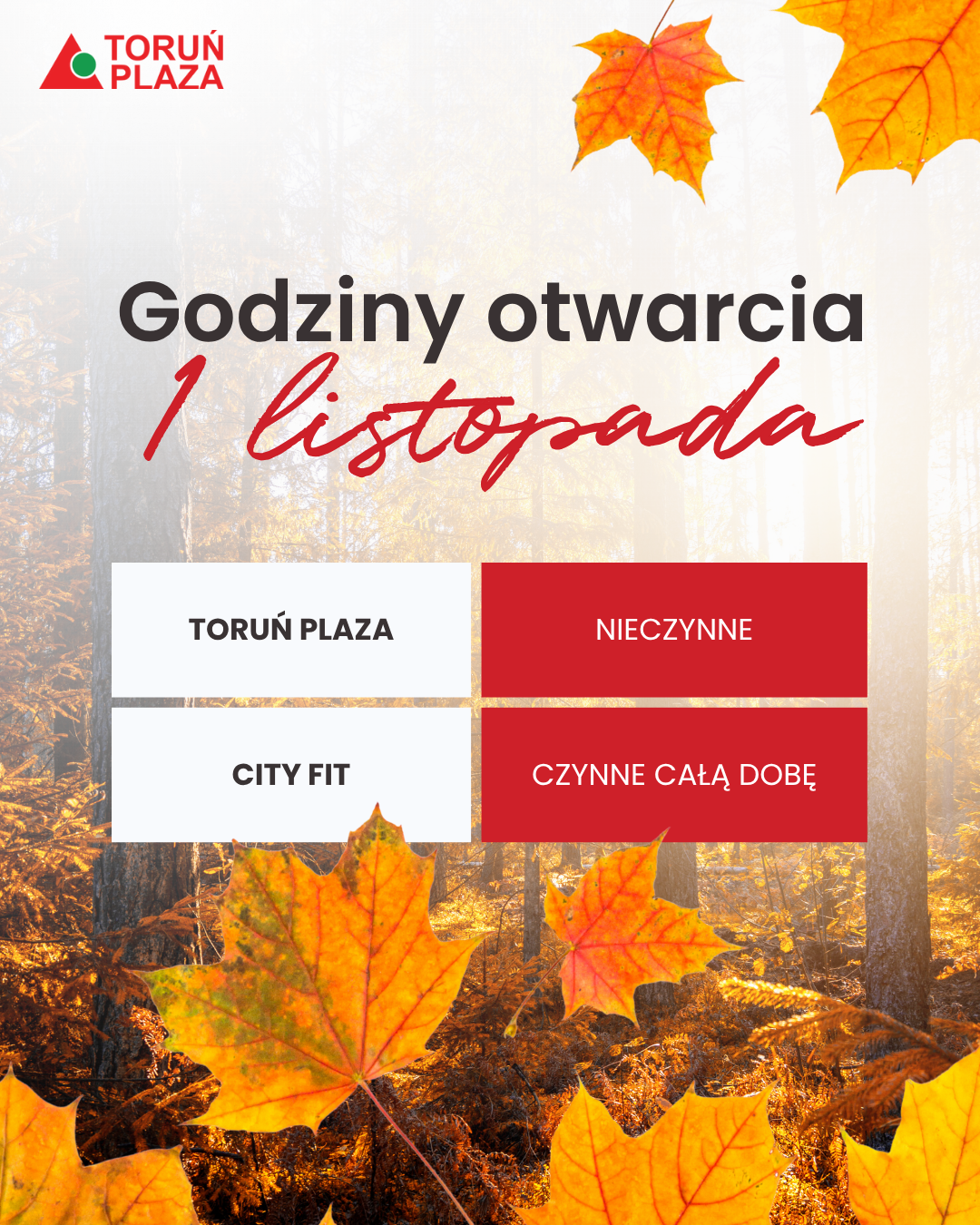 Informujemy, że w sobotę, 1 listopada, Centrum Handlowe Toruń Plaza będzie otwarte w ograniczonych godzinach.